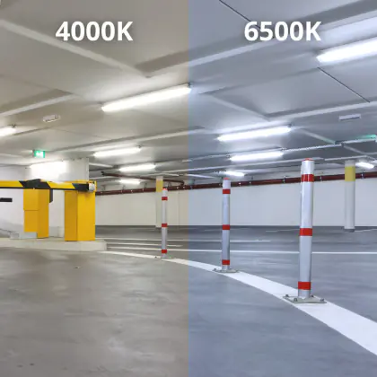 - Farbtemperatur (Kelvin): Die Ausführungen der Feuchtraumleuchte Pro von Budgetlight können in den Farbtemperaturen Kaltweiss (4.000 K) und Tageslichtweiss (6.500 K) bestellt werden.