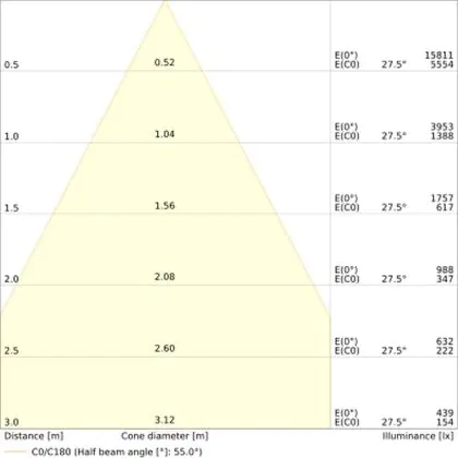 Der Abstrahlwinkel bezeichnet den Winkel, in dem das Licht aus der Lichtquelle ausgestrahlt wird. Er wird in Grad (D) angegeben. Je geringer die Gradzahl des Abstrahlwinkels ist, desto kleiner ist auch der Durchmesser des Lichtkegels, den die Lichtquelle produziert.                                             | Abstrahlwinkel (Grad) | 55 |