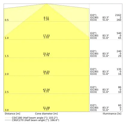 Das Lumen Watt Verhältnis (lm/W) (auch “Lumeneffizienz” genannt) zeigt, wie effizient ein Leuchtmittel Energie in Licht umwandelt. Hierfür wird der Lumenwert durch die Leistung (Watt) geteilt. Je höher die Zahl, desto effizienter nutzt das Produkt Energie. LED-Beleuchtung hat dabei eine wesentlich höhere Lumeneffizienz als herkömmliche Leuchtmittel.                                             | Lumen Watt Verhältnis (Lm/W) | 106 |
