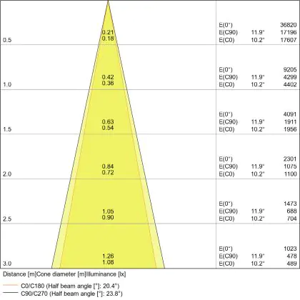 Der Abstrahlwinkel bezeichnet den Winkel, in dem das Licht aus der Lichtquelle ausgestrahlt wird. Er wird in Grad (D) angegeben. Je geringer die Gradzahl des Abstrahlwinkels ist, desto kleiner ist auch der Durchmesser des Lichtkegels, den die Lichtquelle produziert.                                             | Abstrahlwinkel (Grad) | 24 |
