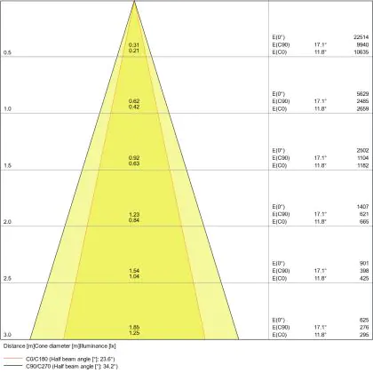 Der Abstrahlwinkel bezeichnet den Winkel, in dem das Licht aus der Lichtquelle ausgestrahlt wird. Er wird in Grad (D) angegeben. Je geringer die Gradzahl des Abstrahlwinkels ist, desto kleiner ist auch der Durchmesser des Lichtkegels, den die Lichtquelle produziert.                                             | Abstrahlwinkel (Grad) | 15 |