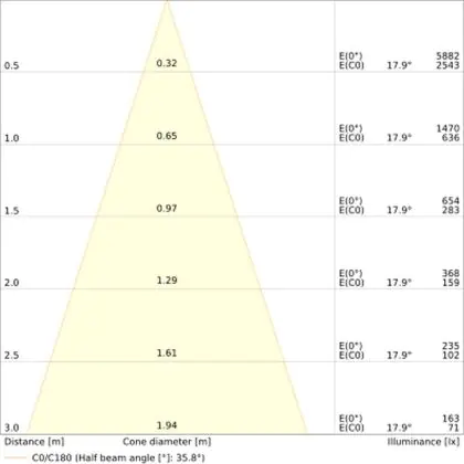 Der Abstrahlwinkel bezeichnet den Winkel, in dem das Licht aus der Lichtquelle ausgestrahlt wird. Er wird in Grad (D) angegeben. Je geringer die Gradzahl des Abstrahlwinkels ist, desto kleiner ist auch der Durchmesser des Lichtkegels, den die Lichtquelle produziert.                                             | Abstrahlwinkel (Grad) | 36 |