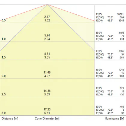Der Abstrahlwinkel bezeichnet den Winkel, in dem das Licht aus der Lichtquelle ausgestrahlt wird. Er wird in Grad (D) angegeben. Je geringer die Gradzahl des Abstrahlwinkels ist, desto kleiner ist auch der Durchmesser des Lichtkegels, den die Lichtquelle produziert.