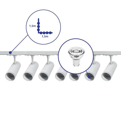 | Nom du fabricant | Complete L shaped 1-Phase Track Set White incl. 7x Spot fixture + GU10 2700K 3W Dim – 1,5 x 1,5 mete | |
