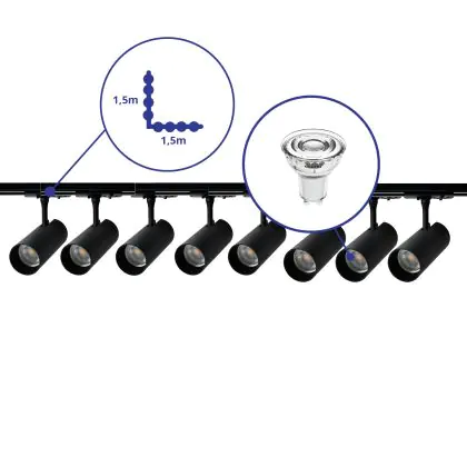 Description Ensemble complet Rail Monophasé Rail L 1,5 x 1,5 Mètre Noir | incl. 8x Spot + GU10 2700K 3W Dimmable + Embout, Connecteur d’Alimentation et L -Connecteur