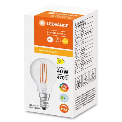 Cette ampoule Ledvance Classic LED E14 Poire Filament Claire 3.4W 470lm - 927- | Meilleur rendu de couleur - Dimmable - Remplacement 40W avec son efficacité lumineuse de lumen par watt vous permettra de profiter d’un éclairage de qualité. Avec sa durée de vie de 15000 heures, vous n’aurez pas à vous soucier de son remplacement avant quelques années.
