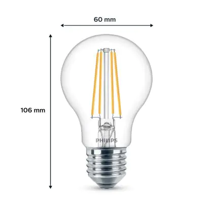 Cette ampoule Lot 2x Philips Ampoule LED E27 Poire Filament Claire 7W 850lm - 840 avec son efficacité lumineuse de lumen par watt vous permettra de profiter d’un éclairage de qualité. Avec sa durée de vie de 15000 heures, vous n’aurez pas à vous soucier de son remplacement avant quelques années.