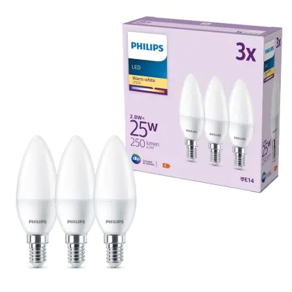 | Nom du fabricant | Box 3 stuks - Philips LED Kaarslamp Mat - 25 W - E14 - Warmwit licht | |