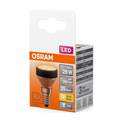 Cette ampoule Osram LED Plat Lamp E14 Special Dépolie 3.5W 300lm - 827 | Remplacement 25W avec son efficacité lumineuse de lumen par watt vous permettra de profiter d’un éclairage de qualité. Avec sa durée de vie de 25000 heures, vous n’aurez pas à vous soucier de son remplacement avant quelques années.