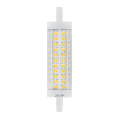 Osram Parathom Line LED R7s 118mm 19W 2452lm - 827 | Dimmable - Remplacement 150W est une ampoule tubulaire linéaire à double extrémité. Ce type d’ampoule permet de délivrer une lumière homogène à 360° avec comme température de couleur 2700K - Blanc Très Chaud. Cette ampoule LED R7s de chez Osram est la solution idéale pour le remplacement de vos anciennes ampoules halogènes. Cette ampoule LED n’a pas besoin de transformateur, elle fonctionne avec 230V et peut se connecter directement sur le secteur électrique.