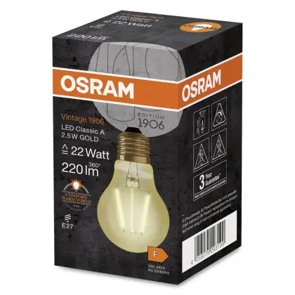 Cette ampoule Osram Vintage 1906 LED E27 Poire Filament Dorée 2.5W 220lm - 824 | Remplacement 25W avec son efficacité lumineuse de lumen par watt vous permettra de profiter d’un éclairage de qualité. Avec sa durée de vie de 15000 heures, vous n’aurez pas à vous soucier de son remplacement avant quelques années.